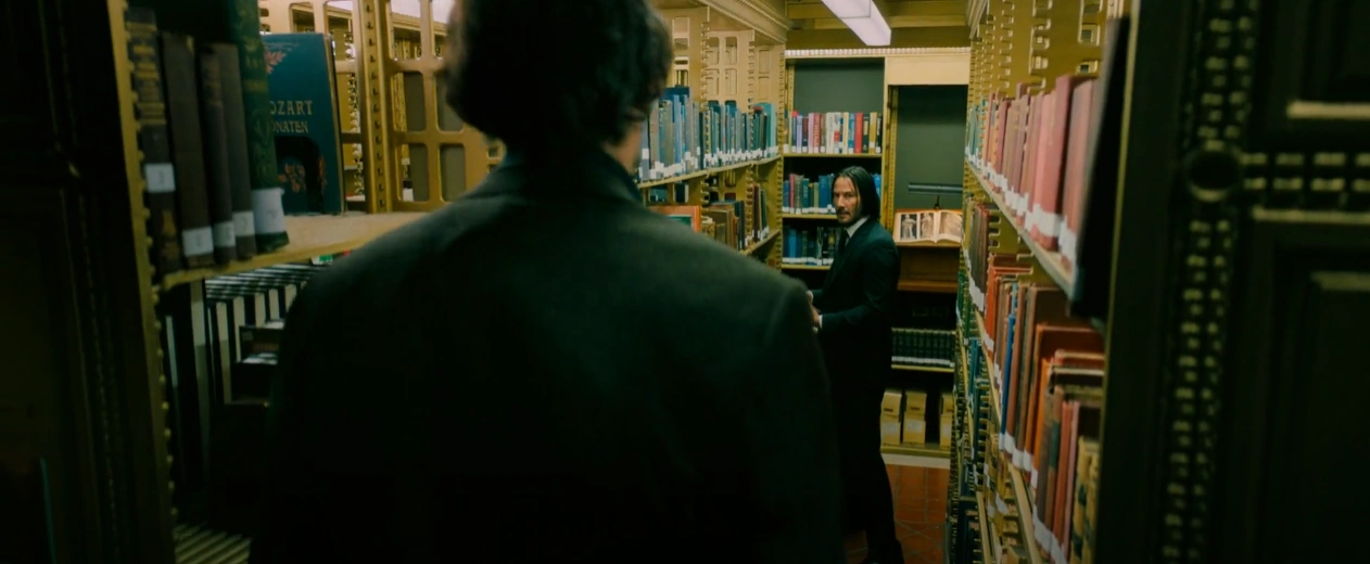 After The High Table doubled the open contract on John Wick, John went to the New York Public Library to collect several helpful items he'd stashed there previously. After this, Ernest appeared, approaching John while quoting from a library book. John told Ernest that he still had time before the contract went live, but Ernest says it's almost up, and that nobody would know the difference. John sternly asked Ernest if he's sure this is what he wants to do. Ernest confirmed so, wishing to claim the $14 million bounty for killing John. John taunts 'not if you can't spend it', and the two begin to fight.
